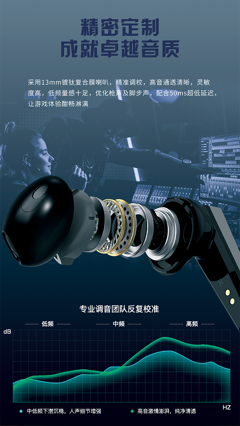 金耳朵s600游戏耳机采用了蓝牙5.2无线方案,同时针对游戏场景,搭载低延迟技术,平均延迟约50ms,支持音乐模式与游戏模式两种状态切换。在游戏模式下,声画同步性很不错,延迟基本感觉不出来,优化了枪声及脚步声,游戏效果非常惊艳。在音乐模式下,凭借13mm大尺寸镀钛复合膜单元,音效表现可圈可点,高音通透清晰,低频量感十足,非常适合听流行音乐。